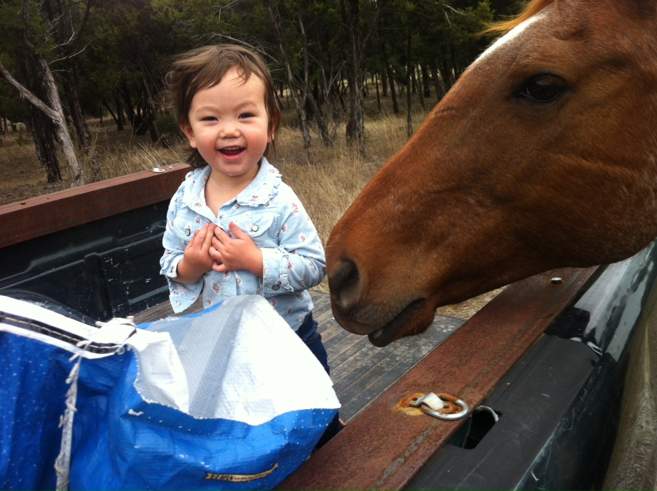as usual, some large animal spent the night in our backyard, this time rhone. em was particularly excited about seeing him, she gave him multiple hugs and kisses and has not stopped saying horsie since.